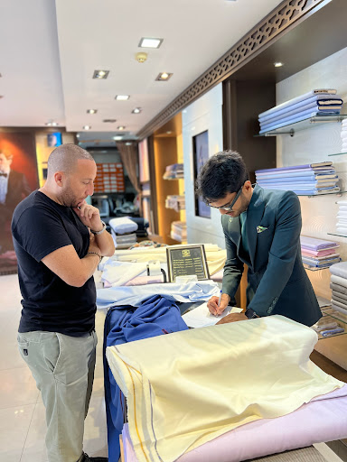 Male clients can visit Kachins Couture at their Dubai location to schedule consultations for couture suit projects, discuss sophisticated menswear requirements, and arrange fitting appointments for couture-level suit creation and formal wear tailoring services.
