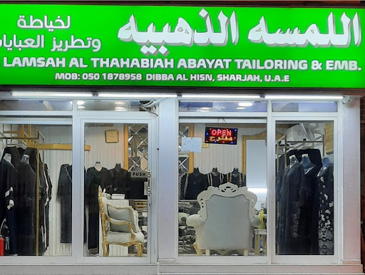 Al LAMSA AL THAHABIAH ABAYAT TAILORING & EMB. in Sharjah offers women's custom tailoring at Al Akd Al Fareed Street 108. Services include dress creation, alterations, fitting, and personalized clothing construction for female clients. Rated out of 5 based on reviews.